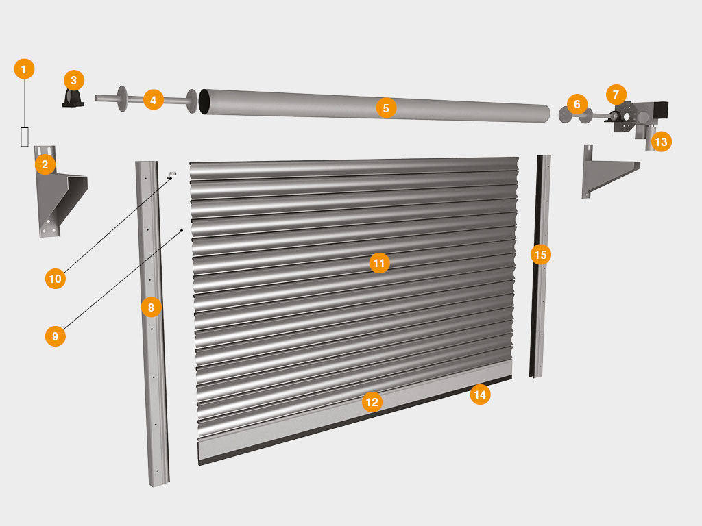 Полотно на валу в сборе состоит из вала с капсулами диаметром 102 мм, нарезки сплошного или перфорированного стального, оцинкованного профиля высотой 117 мм и толщиной 0,8 мм. Полотно может быть окрашено в любой из доступных для выбора цветов.Концевой профиль состоит из алюминиевого экструдированного профиля RA120E с толщиной стенки 2,5 мм и нижнего уплотнителя UP4.Комплект направляющих профилей состоит из двух стальных направляющих с уплотнителем. Направляющие профили могут быть окрашены в любой из доступных для выбора цветов.Электропривод навальный поставляется с комплектом кронштейнов и метизов для крепления привода и суппорта с подшипником.Дополнительная комплектация
