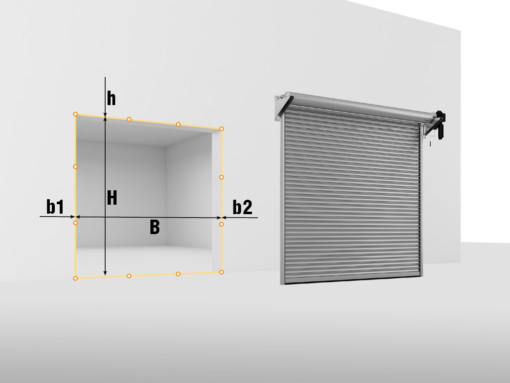 Накладной монтаж. Для накладного монтажа не требуется трудоемкая подготовка проема, только необходимые размеры пристенков (от 500 мм) и притолоки (от 650 мм). При накладном типе монтажа рулонных ворот вал с роликовым полотном и консоли с вальным электроприводом устанавливают над проемом, а направляющие профили – по обеим сторонам от него. Закрытые рулонные ворота при этом полностью перекрывают проем и находятся практически вровень с поверхностью стен.