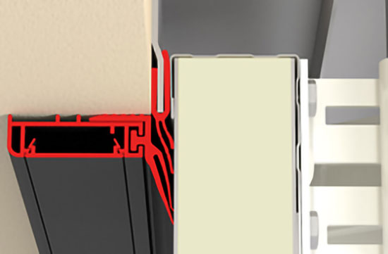 Встроенный монтаж встык (при отсутствии пристенков): несущий наличник устанавливается на проем встык. На него монтируется система направляющих. Система регулируемых кронштейнов позволяет нивелировать неровности стен. Несущий наличник имеет эстетичный внешний вид, окрашивается в RAL 9003 (белый) или RAL 8014 (коричневый).