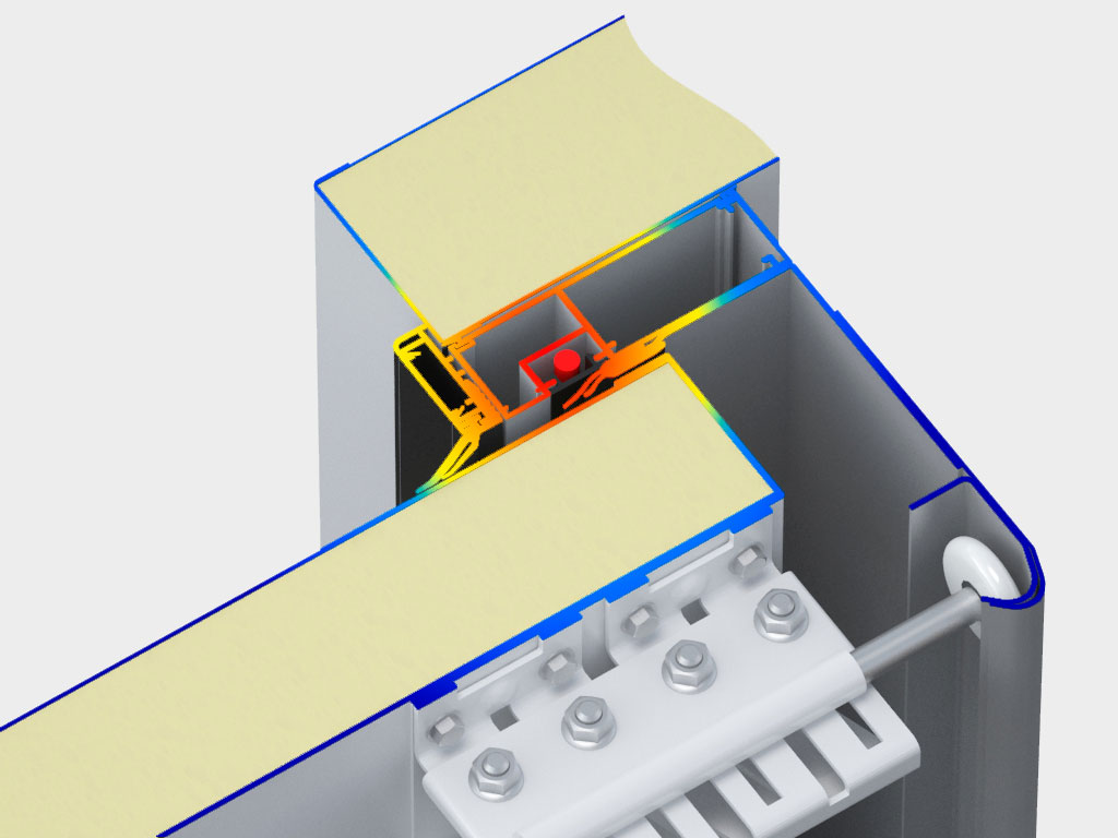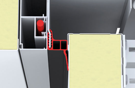 Сэндвич-панель толщиной 80 мм в совокупности с системой теплых профилей, снабженных терморазделительными вставками, не допускает промерзание панели.