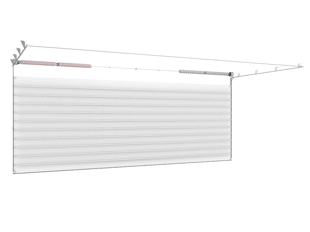 Полотно из алюминиевых сэндвич-панелей толщиной 40 мм с силовыми элементами для надежной фиксации петель, боковых опор и усиливающего профиля.Повышенные прочностные характеристики панелям придает экструдированный алюминиевый профиль (устанавливается при ширине от 3 500 мм), обеспечивающий наилучшие показатели по сопротивлению ветровым нагрузкам.Фурнитура щита (боковые опоры, верхние кронштейны, петли, метизы) ворот выполнена из нержавеющей стали.Комплект направляющих и угловых стоек из стали толщиной 2 мм обладает повышенным запасом прочности, имеет все необходимые для монтажа перфорации.Торсионный механизм, рассчитанный на 25 000 циклов, обеспечивает долговечность конструкции ворот, а также открывание и закрывание ворот без усилий.Устройство защиты от обрыва троса устанавливается в качестве нижнего кронштейна на полотно ворот. В случае обрыва троса механизм срабатывает и предотвращает падение полотна ворот.Устройство защиты от обрыва пружины блокирует вал при нештатных ситуациях, что предотвращает падение полотна ворот.Дополнительная комплектация